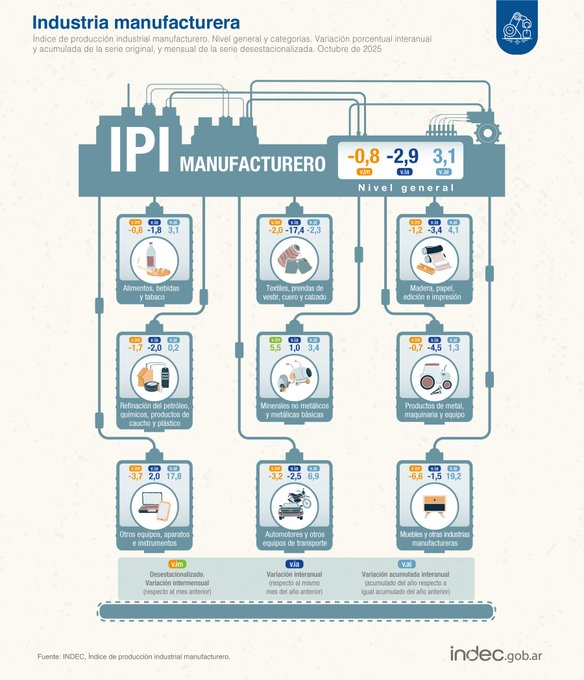 La producción industrial cayó 2,9% en octubre en comparación con el mismo mes de 2024, informó el Indec en su Índice de Producción Industrial manufacturero (IPI).