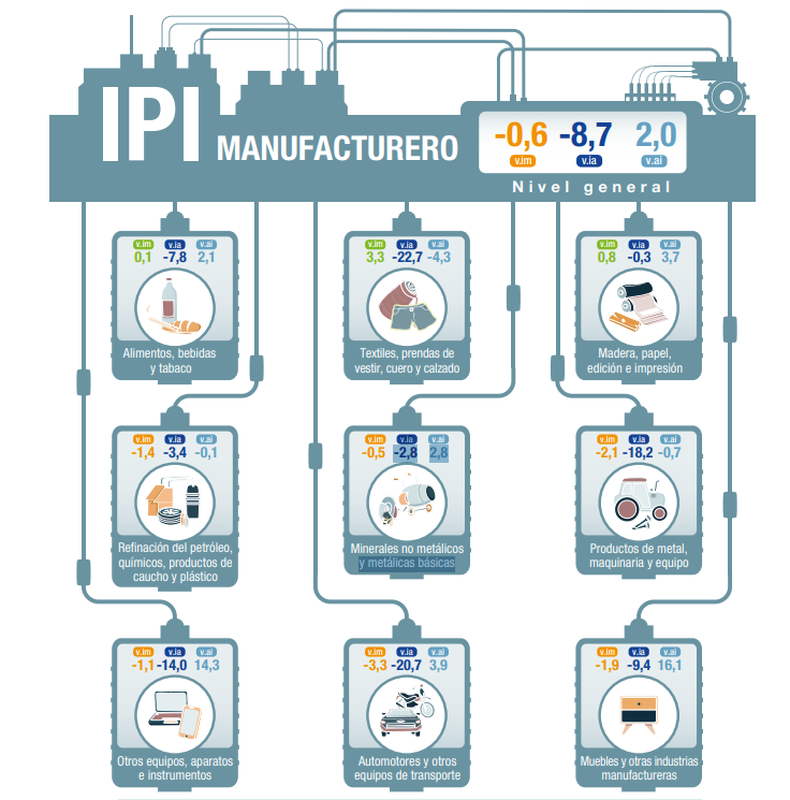 También se destacaron los retrocesos en “Prendas de vestir, cuero y calzado” (17,6%), “Productos de metal” (18,6%), “Productos textiles” (36,7%) y “Productos de caucho y plástico” (12,5%). A su vez, se registraron caídas en “Sustancias y productos químicos” (3,4%), “Industrias metálicas básicas” (3,1%) y “Productos minerales no metálicos” (2,4%).
