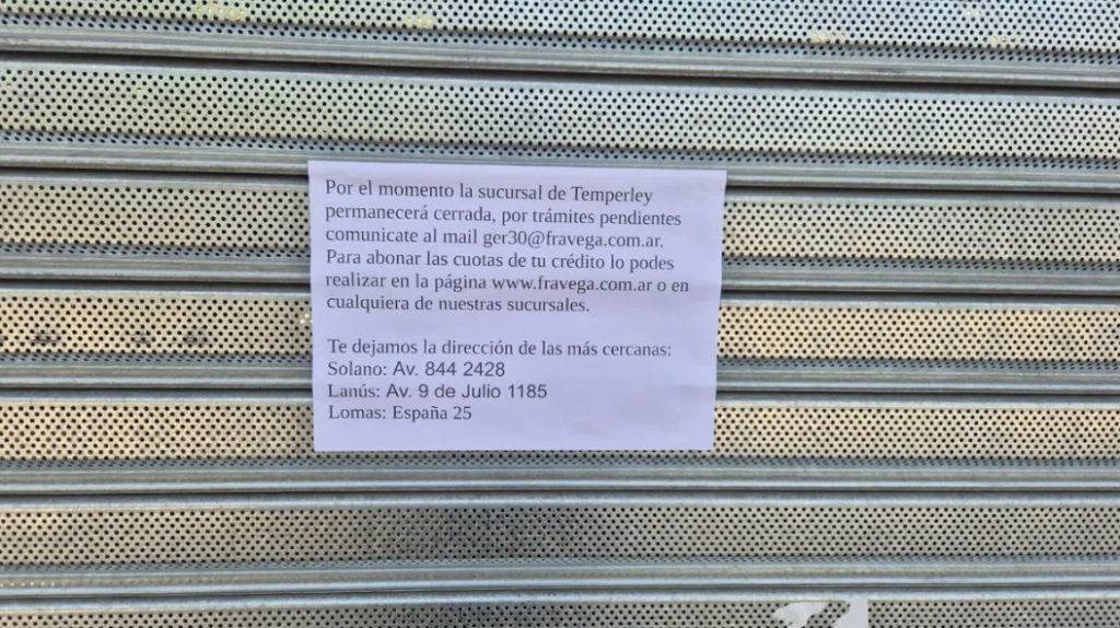El repentino cierre de una sucursal de Frávega en Temperley encendió una fuerte alarma entre trabajadores y organizaciones gremiales. La tienda ubicada en Pasco y Salta amaneció este martes con las persianas bajas, sin aviso previo y con la noticia de despidos comunicada de hecho cuando los empleados llegaron a cumplir su horario laboral. El hecho desató indignación y preocupación ante lo que se interpreta como una señal de un ajuste mayor dentro de la cadena de electrodomésticos.