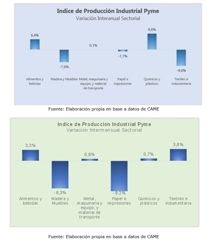 La mejor performance en septiembre estuvo en “Químicos y Plásticos” con un aumento anual de 9,8 por ciento. Detrás quedó “Alimentos y bebidas” con una suba interanual de 6,4 por ciento. “Metal, maquinaria y equipo” permaneció estable con una suba de apenas 0,1 por ciento, mientras que los otros tres sectores relevados registraron bajas: “Papel e impresiones” cayó 1,1 por ciento, “Madera y muebles” 7,6 por ciento y “Textiles e indumentaria” un 9,8 por ciento.