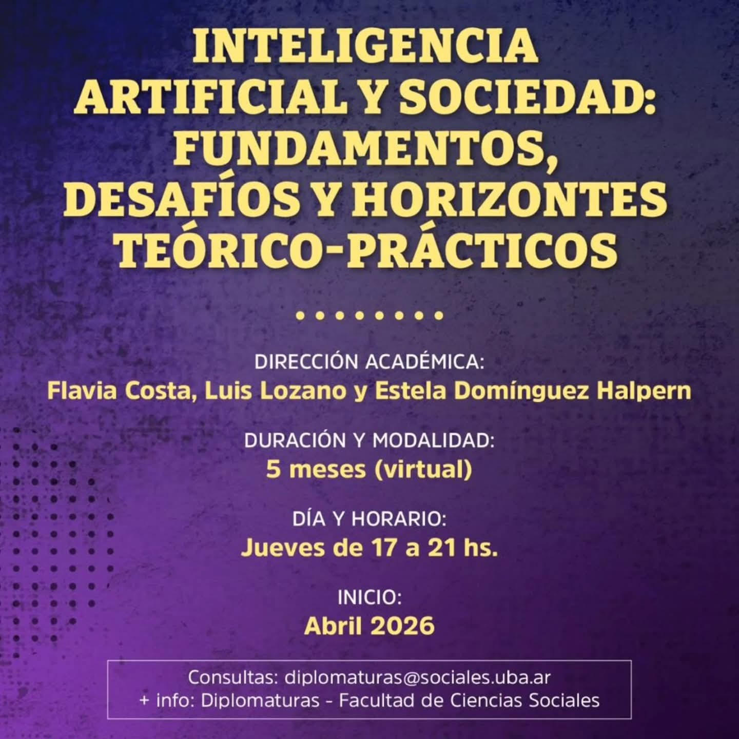 Un Diploma en Medios Públicos en América Latina, cuya directora académica es Jesica Tritten. Y una Diplomatura en Inteligencia Artificial y Sociedad: fundamentos, desafíos y horizontes teórico-prácticos, cuyos directores académicos son Flavia Costa, Luis Lozano y Estela Domínguez Halpern.