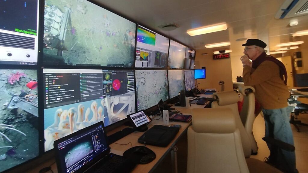 El robot pesa 3.200 kilos, más que una camioneta. Está conectado al Falkor mediante un cable umbilical fuerte y flexible que le provee electricidad. Además, le permite enviar las imágenes del fondo marino a la sala de control, una habitación con paredes cubiertas de pantallas y escritorios con computadoras. Allí se encuentran las dos personas encargadas de hacer las maniobras subacuáticas: una es la que desplaza la nave y otra responsable de los movimientos del brazo mecánico, conocido en redes sociales como “la garra”. Los conductores de SuBastian son personal especializado del Instituto, pero los científicos del CONICET determinan su rumbo, qué especies deben ser recolectadas y hacia dónde apuntar la cámara.